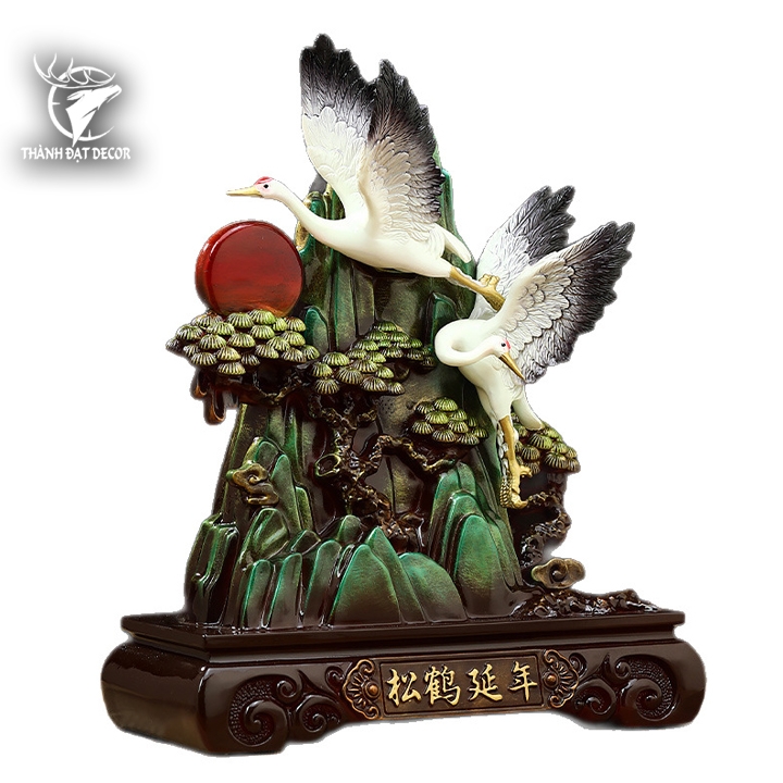✅ Thiết kế nghệ thuật: Hình ảnh đôi chim hạc dang cánh bay lượn trên nền núi non và cây tùng tạo cảm giác uy nghi và yên bình.