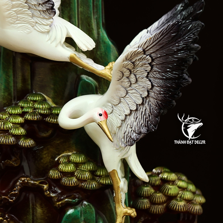 Tượng hai chim hạc đứng dưới cây tùng bên núi đá là hình ảnh biểu tượng phong thủy mạnh mẽ, đại diện cho sự trường thọ, may mắn, bình an và cát tường. Đây không chỉ là vật phẩm trang trí tinh xảo mà còn mang nhiều ý nghĩa sâu sắc trong văn hóa Á Đông.