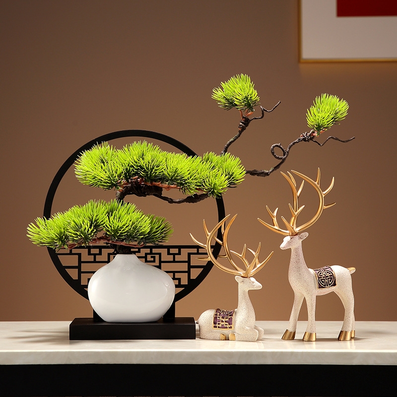 Tượng Decor Cặp Hươu Kèm Kệ Chậu Cây Lá Bách, Quà Tặng Tân Gia Khai Trương Sinh Nhật Trang Trí Nhà